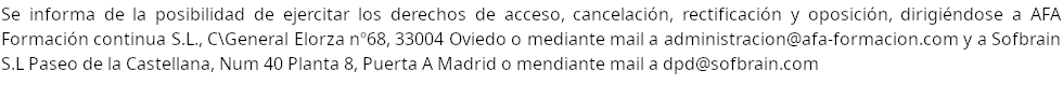 En Sofbrain S.L. y  AFA FORMACIÓN CONTINA S.L. tratamos la información que nos facilita con el fin de prestarles el servicio solicitado y realizar la facturación del mismo. Los datos proporcionados se conservarán mientras se mantenga la relación comercial o durante los años necesarios para cumplir con las obligaciones legales. Los datos no se cederán a terceros salvo en los casos en que exista una obligación legal. Usted tiene derecho a obtener confirmación sobre si en Sofbrain S.L. o AFA FORMACIÓN CONTINA S.L. estamos tratando sus datos personales por tanto tiene derecho a acceder a sus datos personales, rectificar los datos inexactos o solicitar su supresión cuando los datos ya no sean necesarios.